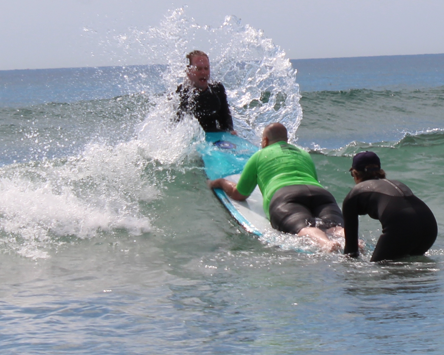 The surf instructor pushes the participant on a wave. Some of the participants are taking the waves on a prone position, others are on their knees and some are even standing up on their feet! The volunteers are in line at the place where the participants catches the wave all the way to the beach, ready to help in case the person falls. And let's be honest, everyone falls at some point, the surf community even have a special name for it: wipeouts! So you've guessed it if the surfers took the time to invent a word it means 1. that falling doesn't describe well enough the action of being ejected from your board and being pushed in every direction by the water while trying to find a way out and 2. that it occurs really often! Actually, doesn't matter if you're a beginner or a professional, wipeouts are part of the sport...as well as part of the fun!