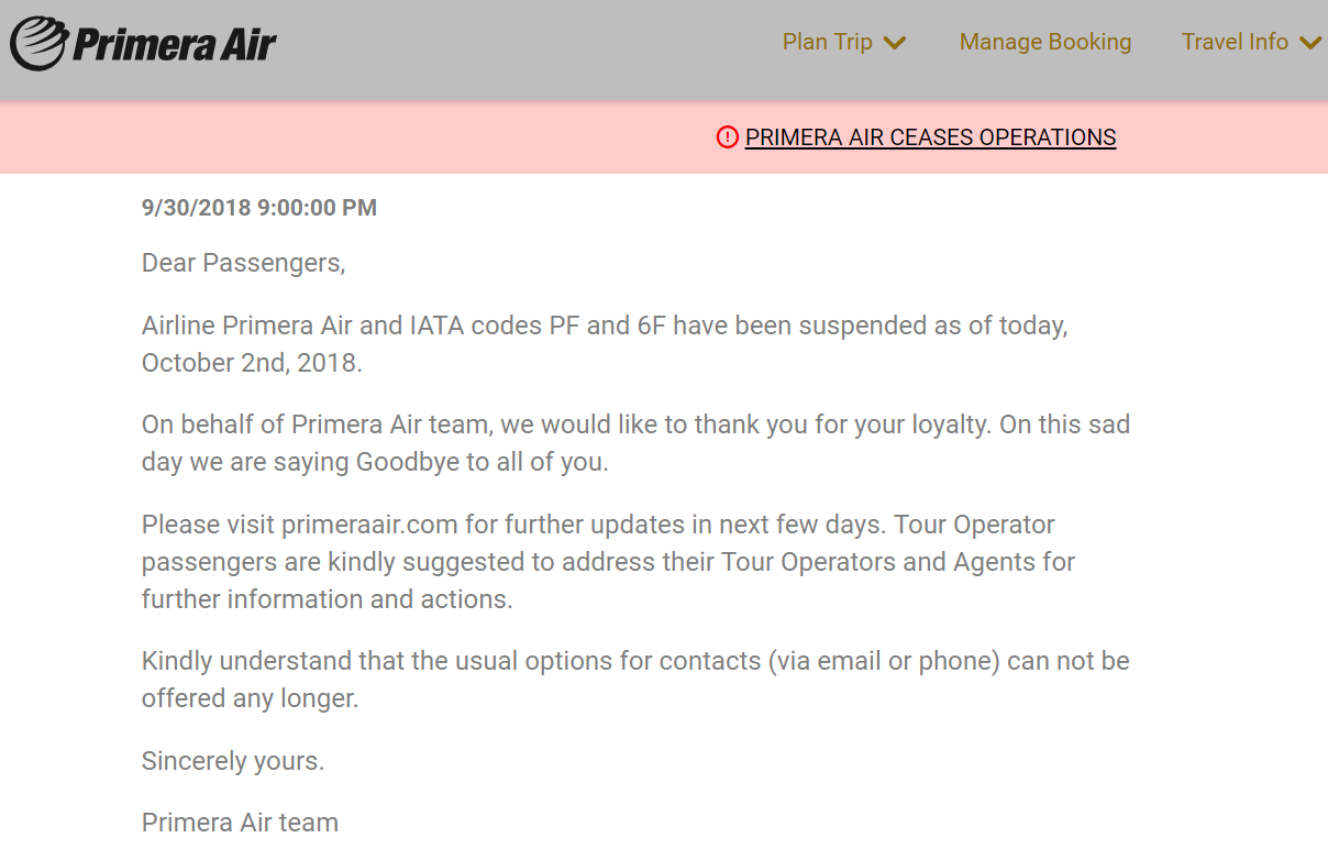 Il est probable que tous les vols de Primera Air seront annulés prochainement, si vous détenez des billets de cette compagnie que vous avez acheté avec une carte de crédit, votre achat sur celle-ci est assuré, vous pouvez demander un remboursement complet directement auprès de votre compagnie de carte de crédit avec laquelle vous avez acheté vos billets.