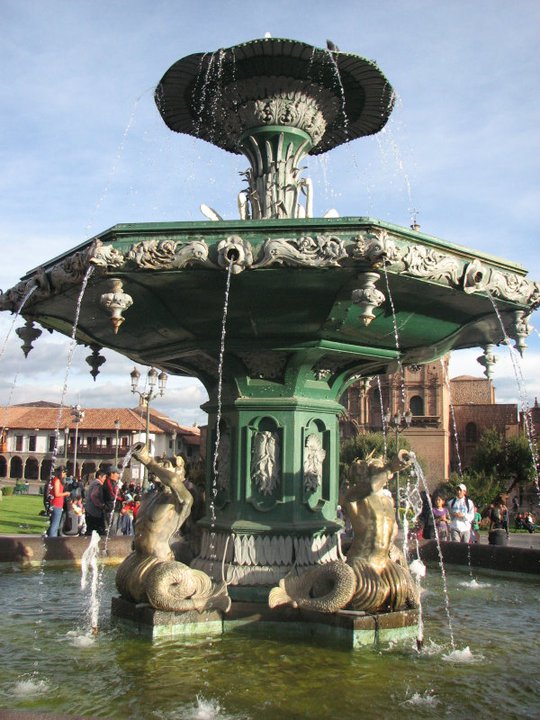 Plaza d'Armas, la belle fontaine avec ses églises et la cathédrale.