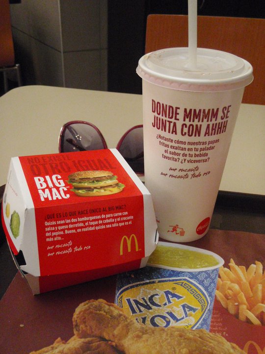 J'ai une drôle d'habitude en voyage, dès que je vois un McDonald's, je n'ai pas le choix d'aller y manger et d'essayer le trio de la place... Bali, Paris, Nicaragua, Costa Rica, Tahiti, Mexique, Panamá et maintenant au Pérou à Cuzco accompagné d'un Incas Kola, la liqueur préféré des péruviens, c'est jaune et très très sucré!